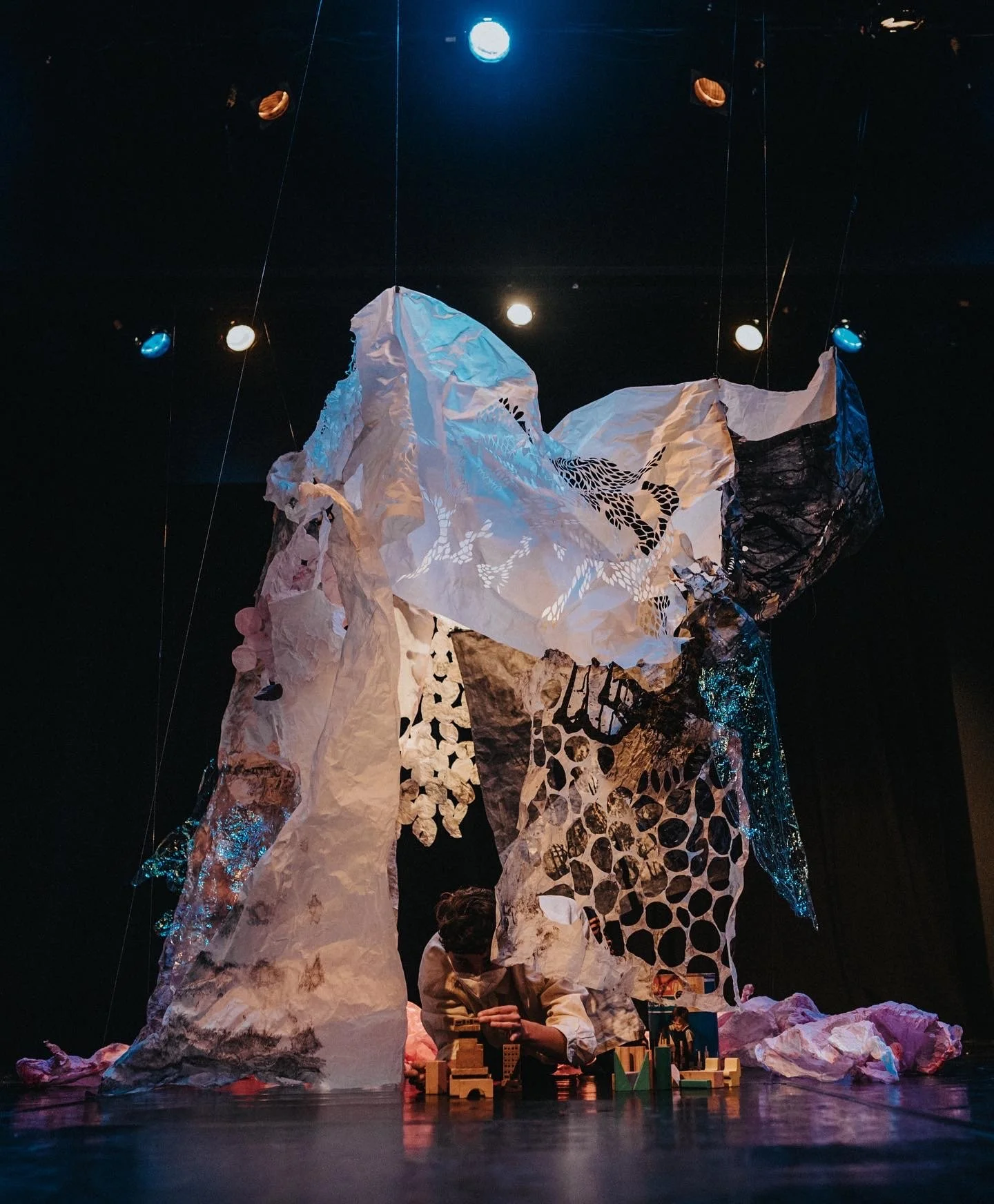 a giant plastic bag / mylar trash heaps / jellyfish / fish bodies / sisters / intimacy / breathability / lack of breathability / plastic-as-performer / otherworldly creatures / cacooning / crochet / death / grief / mundane memorials / playing our way through the horrors / microplastics as roommate / love