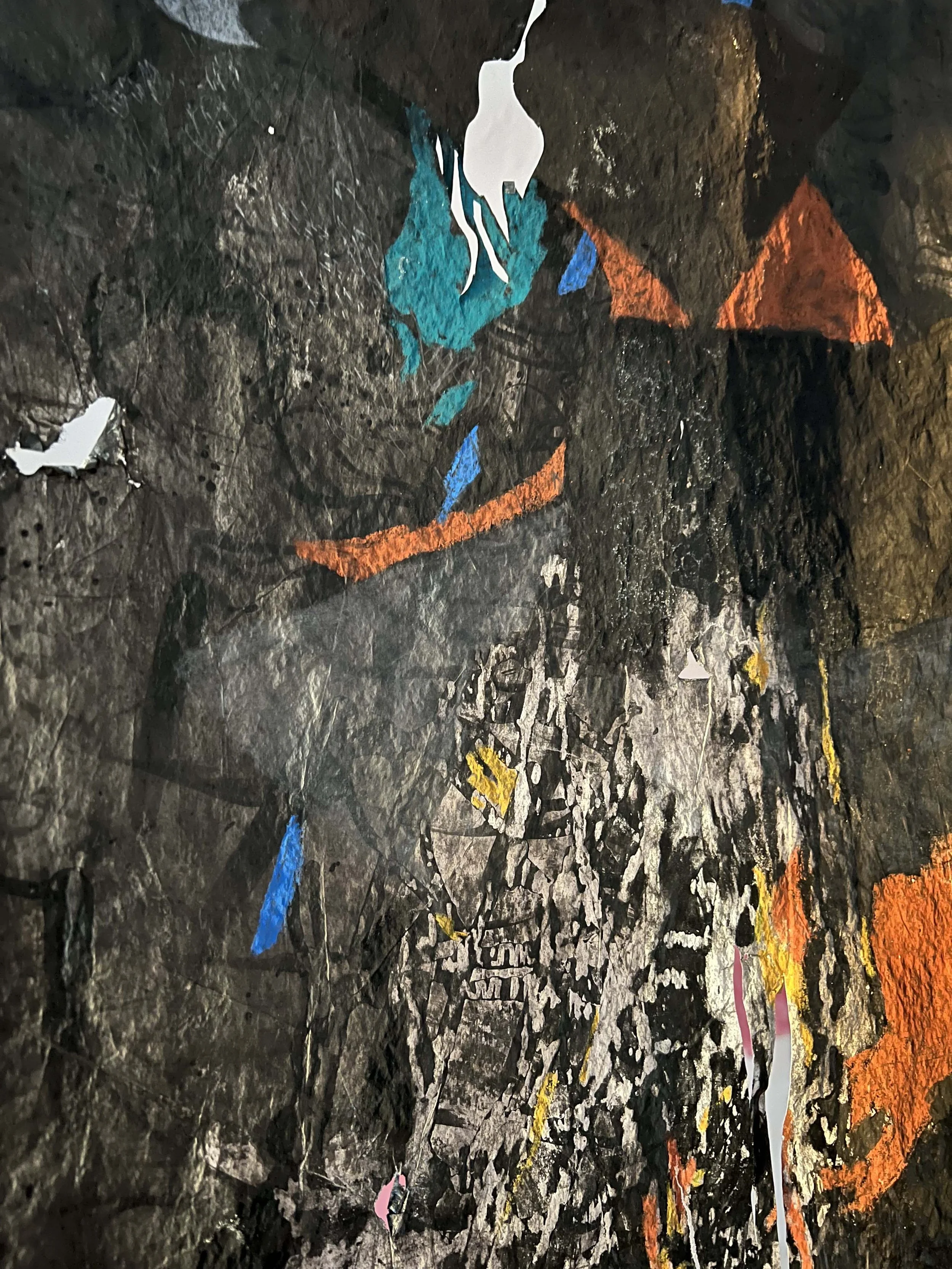 Sculpture made of tracing paper (drawn on with ink and pastel, dyed with beets, sewn together, cut through) and suspended onstage
